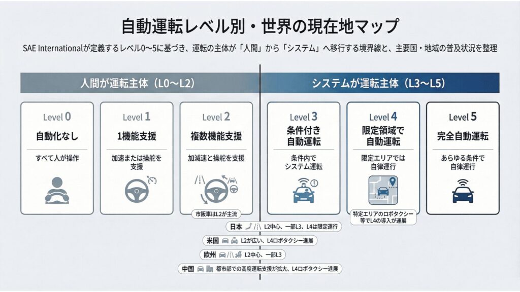 自動運転にはレベル0~レベル5とあり、多くの国内メーカーの車は